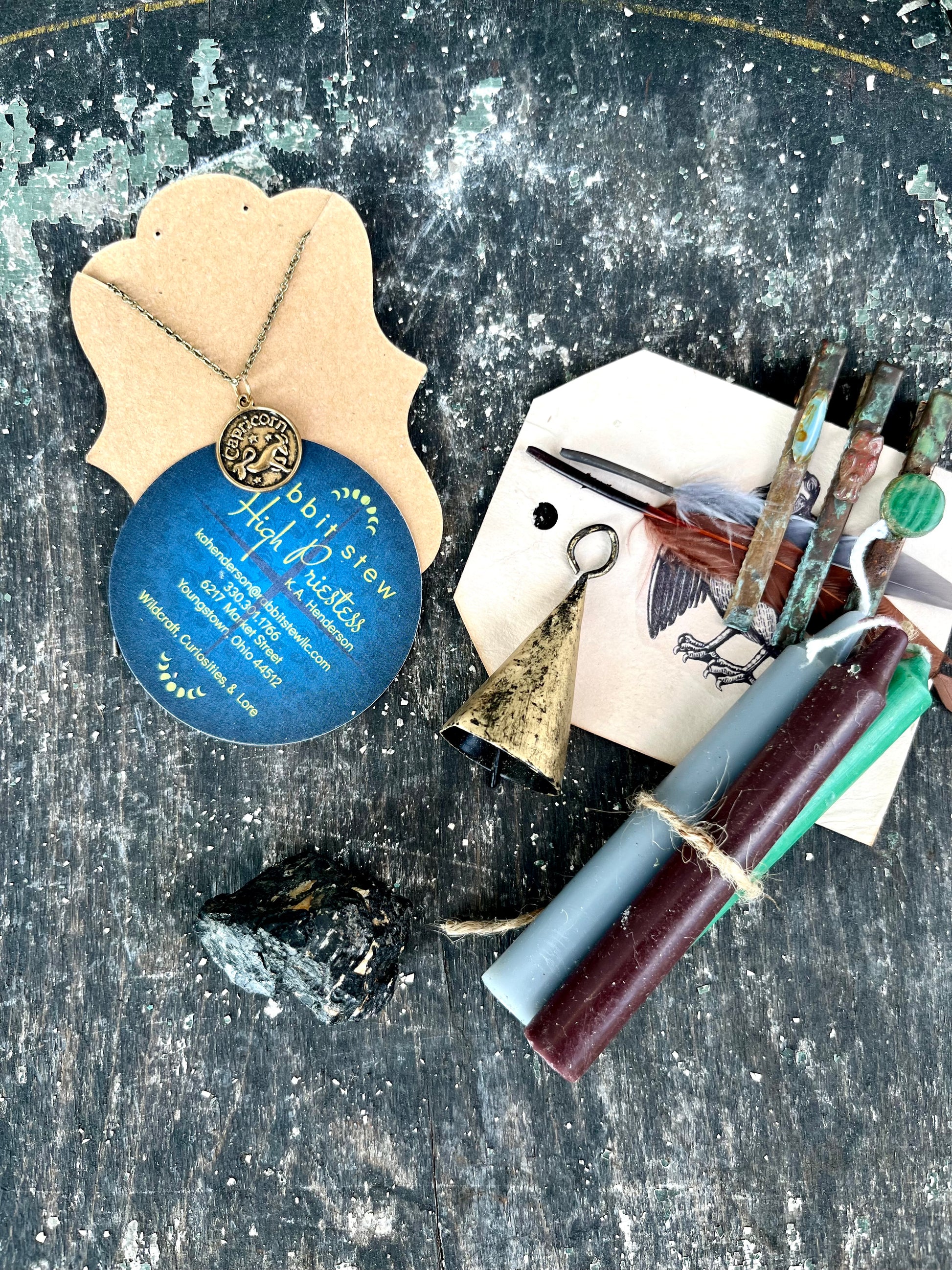 Our Zodiac Box for earthy Capricorns includes three chime candles (blue, maroon, & turquoise), one 16" zodiac necklace in brushed gold, two feathers, one harpy card, three grunge barrettes topped with Czech glass (blue, red, & turquoise), and a piece of raw Obsidian.