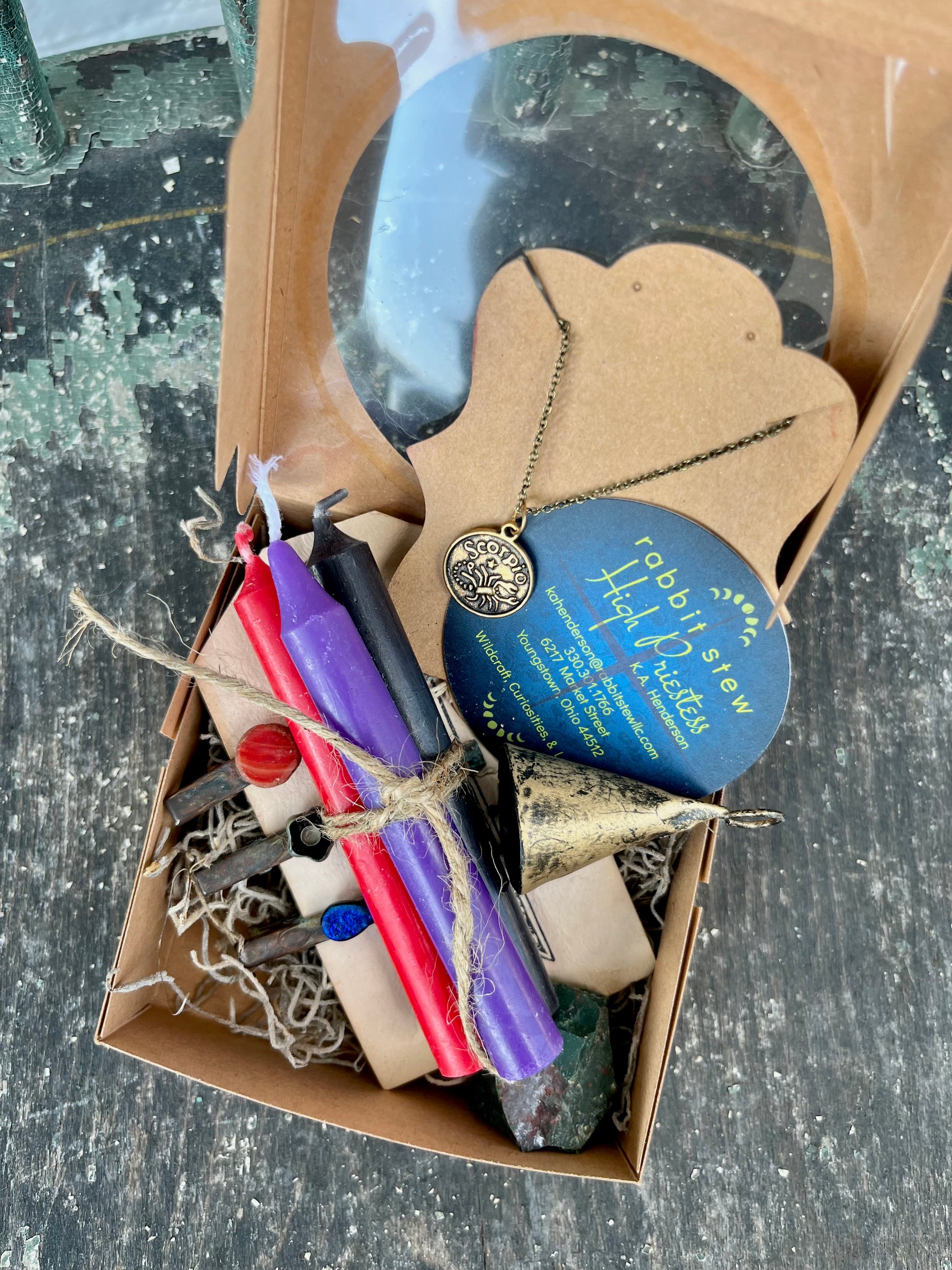 Our Zodiac Box for mysterious Scorpios includes three chime candles (red, purple, & black), one 16" zodiac necklace in brushed gold, two feathers, one headstone art card, three grunge barrettes topped with Czech glass (black, red, & blue), and a piece of semi-precious stone.